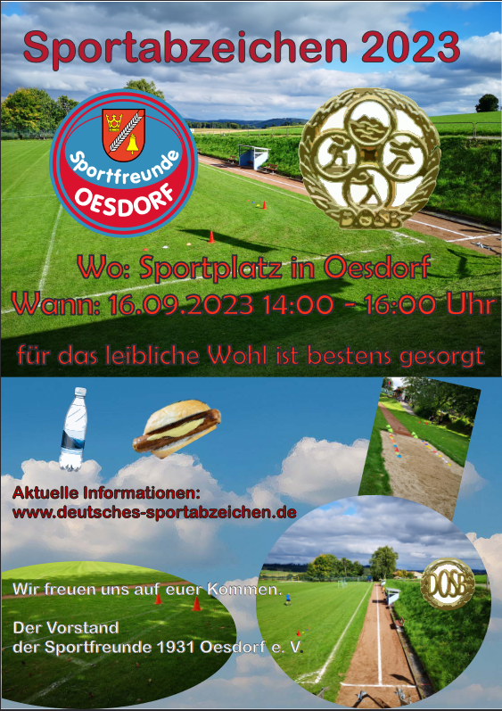 Es ist eine schöne Tradition geworden, das Deutsche Sportabzeichen in Oesdorf abzulegen. Die Sportfreunde 1931 Oesdorf e.V. freuen sich auch in diesem Jahr wieder, die Wettkämpfe zur Erreichung des Deutschen Sportabzeichens 2023 auszurichten.